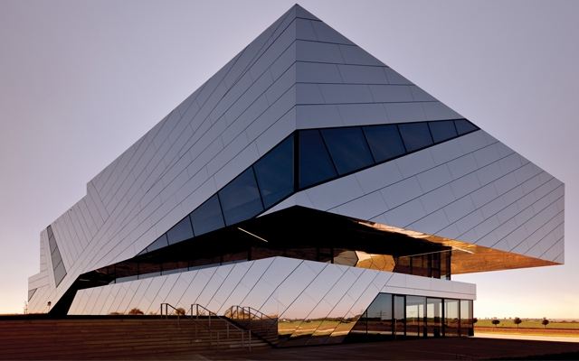 Etrafındaki geniş açılı büyüleyici manzara adeta bu keskin ve büyük formatlı bina cephesini bir anlamda kesintiye uğratarak ormanın yeşilliğini, kömür madeninin kahverengi çukurlarını ve çayırda otlayan Przewalski atlarını kocaman bir ekran gibi yansıtıyor.