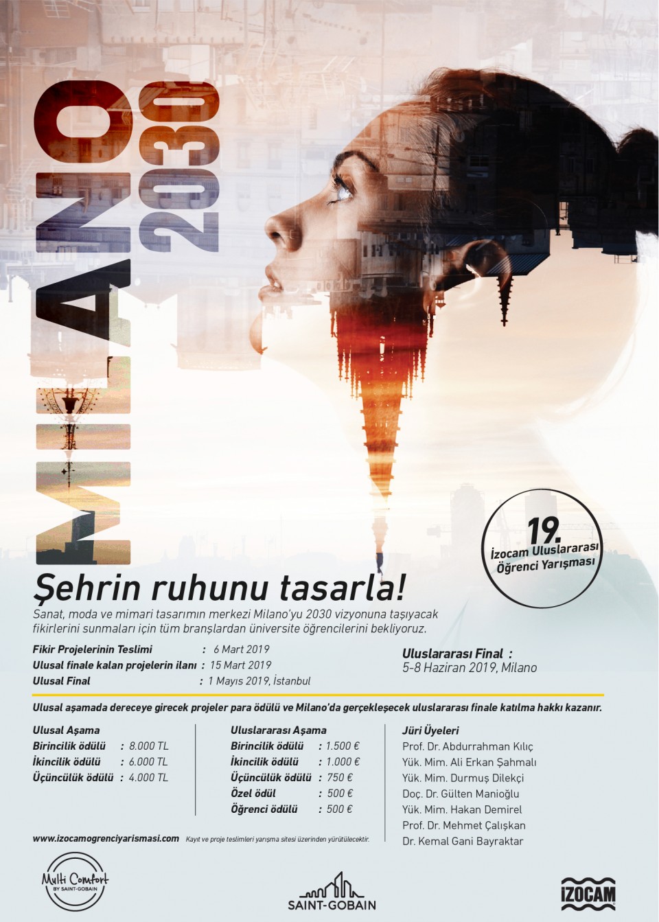 Bu yıl 19. kez düzenlenen ve finali Milano’da gerçekleştirilecek olan İzocam Öğrenci Yarışmasının konusu “Kentsel Bağlam ve Tasarım” olarak belirlendi. Öğrencilerden geleceğin genç ve dinamik şehri olması hedeflenen Milano’da sürdürülebilir büyümenin ve yaşam kalitesini iyileştirmenin esas alındığı “Milano2030” vizyonu doğrultusunda projelerini hazırlamaları bekleniyor.