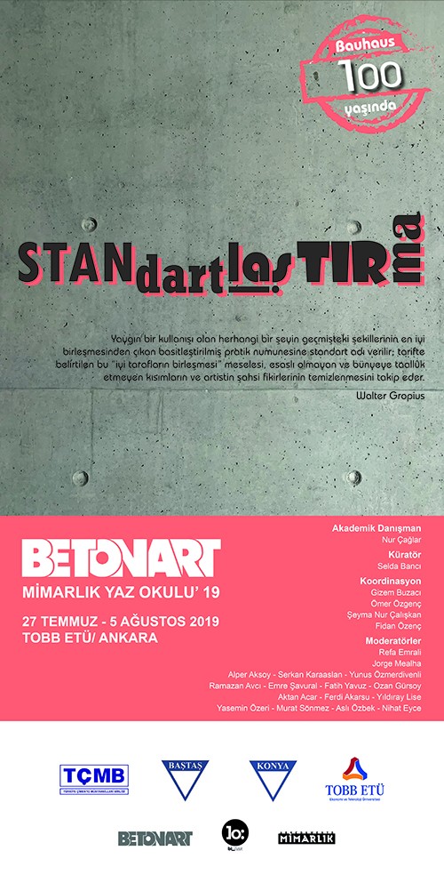 Akademik Danışmanlığını Nur Çağlar’ın, Küratörlüğünü Selda Bancı’nın, moderatörlüklerini, Refa Emrali, Jorge Mealha, Alper Aksoy, Serkan Karaaslan, Yunus Özmerdivenli, Ramazan Avcı, Emre Şavural, Fatih Yavuz, Ozan Gürsoy, Aktan Acar, Ferdi Akarsu, Yıldıray Lise, Yasemin Özeri, Murat Sönmez, Aslı Özbek ve Nihat Eyce’nin yapacağı BETONART Mimarlık Yaz Okulu’nun bu yılki teması, “Standartlaştırma”.