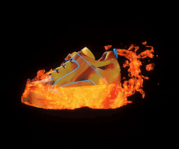 Buffalo London ve The Fabricant’tan bu sanal spor ayakkabı, parıldayan mavi ve turuncu bir alevle çevreleniyor. Bu spor ayakkabı yalnızca özel 3D yazılım kullanılarak alıcının fotoğrafına yerleştirilerek “giyilebilir”.