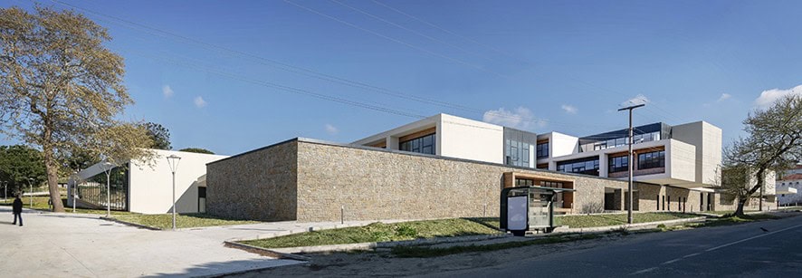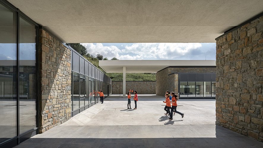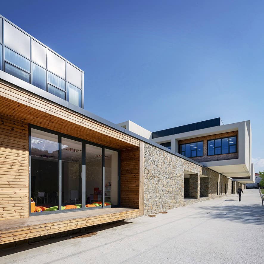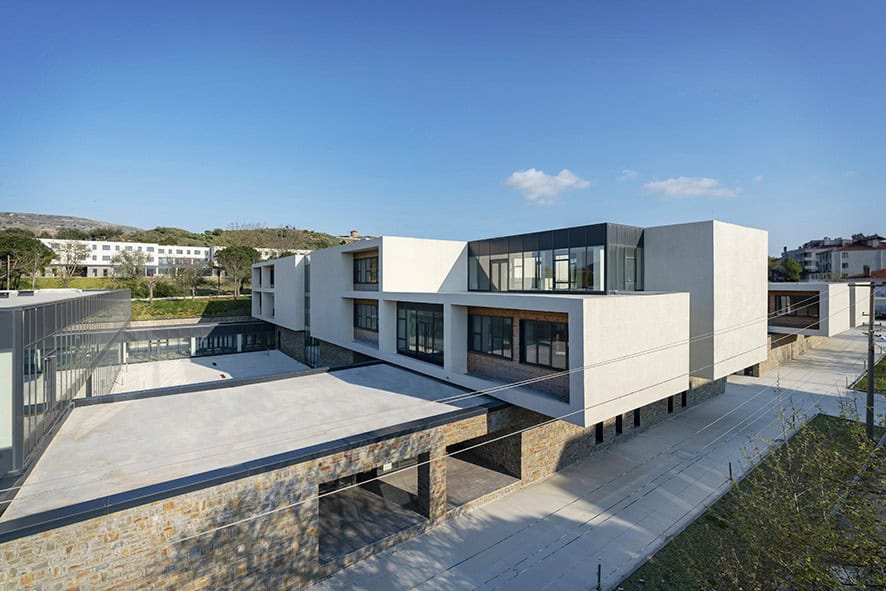 Gökçeada’nın organik planlı köylerindeki küçük ölçekli taş evlerden oluşan karakteristik dokusu, malzeme kararı olarak seçilen yerel taş doku ile ve parçalı ve az katlı yapılaşma kararında yeniden yorumlanır. Yaya rotası üzerinde ve meydan etrafında konumlanan büyük hacimlere sahip spor salonu ve konferans salonu gibi kütleler ise, arazideki şevlerden ve kot yapısından faydalanarak kısmi olarak yer altına alınarak, kütlelerin insan ölçeği ve doğal doku ile ilişkisinin korunması sağlanır.