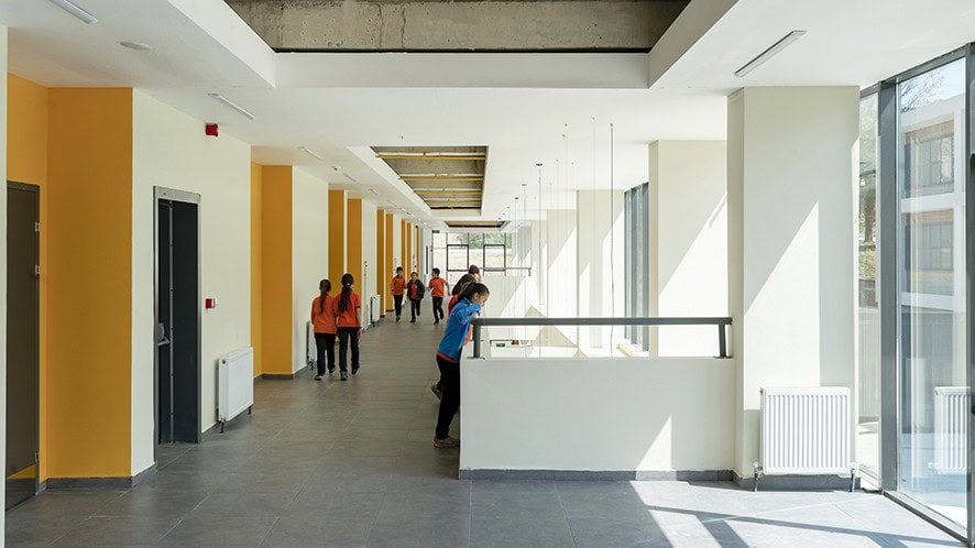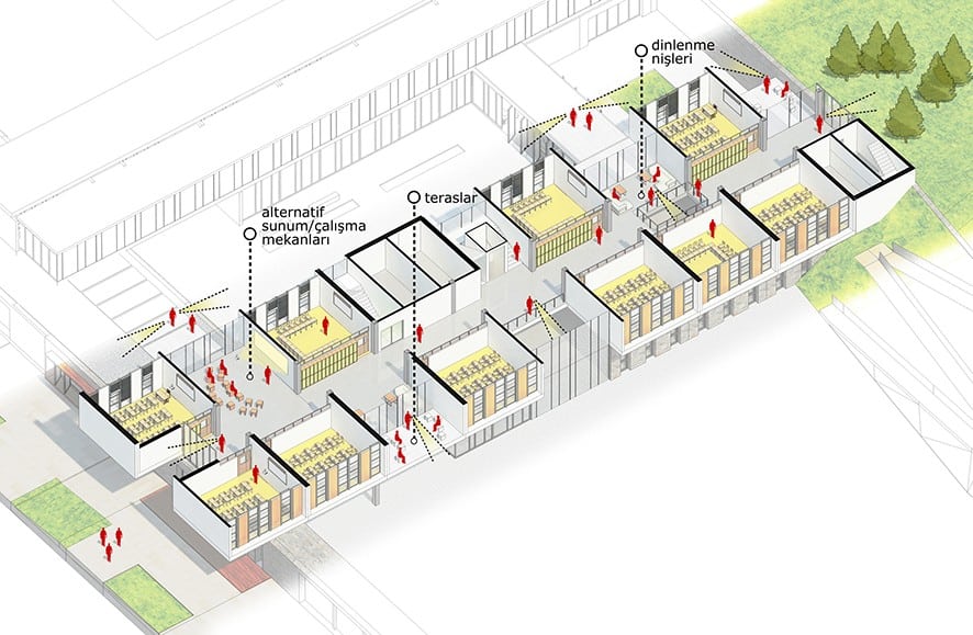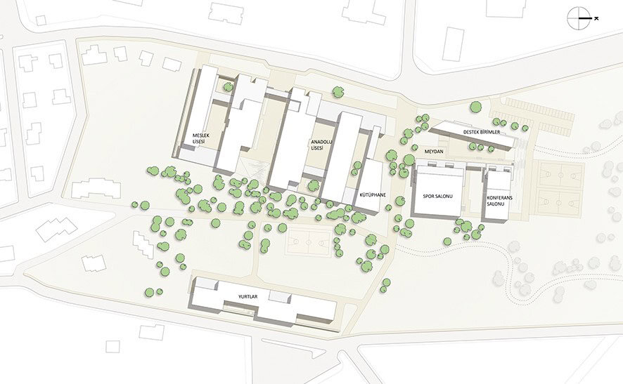 Meslek Lisesi ve Anadolu Lisesi’ne ait öğrenim mekânları, iki kurumun bu mekânları ortak bir şekilde paylaşabileceği düzende, öğrenciler ve öğretmenler arasındaki etkileşimi (dolayısıyla etkileşim ile öğrenmeyi) üst seviyeye çıkarak şekilde kurgulanır. Öğrenim mekânları ve ilgili sosyal donatılar, parçalı ve az katlı bir yapılaşma oluşturur. Zemin katta iki kurumun ortak kullanabileceği birimler (laboratuvar, ortak derslikler, yemekhane, vb.) geçirgen ve yaya akışı sağlayacak şekilde düzenlenerek, hem öğrenciler hem de öğretmenler için korunaklı açık ve yarı açık alanlar oluştururlar. Farklı karakterlere sahip bu alanlar ve iç avlular öğrencinin aidiyet hissini kuvvetlendirerek açık alan kullanımına, fiziksel harekete ve dolayısıyla etkileşime katkı sağlar. Öğrenim mekânları, sahip oldukları farklı açılım noktaları ile cadde, meydan, koru ve yurt ile ilişki kurabilir. Gerektiğinde ise, kısmi müdahalelerle eğitim alanına dışarıdan erişim kolayca kontrollü hale gelebilir. Parçalı yapılaşma, derslik-koridor düzeninde de kendisini hissettirerek üst katlarda koridorlar üzerinde kapalı teneffüs nişleri ile yarı açık ve açık teraslar sağlayarak öğrenimin sınıf dışında da devam etmesini teşvik eder; doğal ışık ve hava yönünden zengin sirkülasyon alanlarının oluşmasını sağlar.