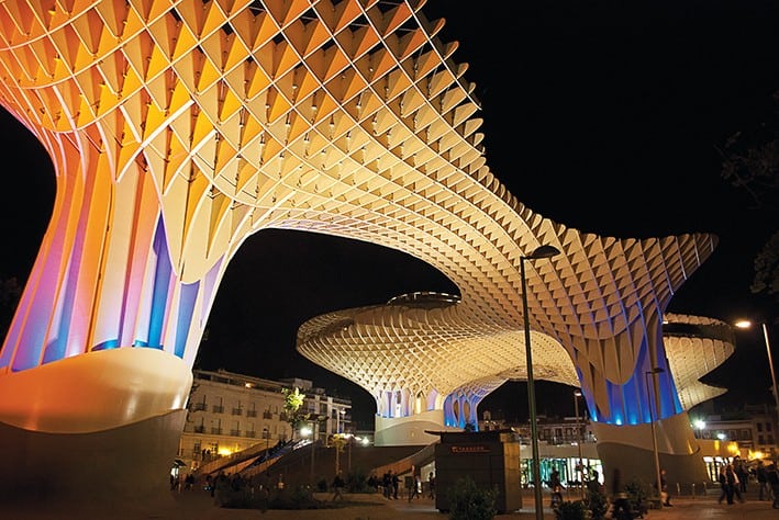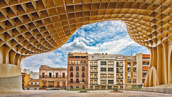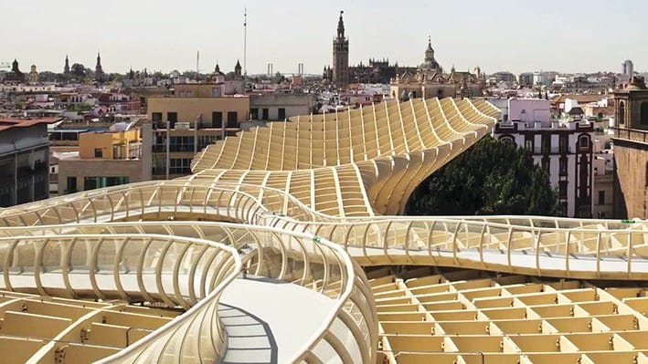 En iyi örneğimiz, 2004-2005 yılında Mimar Jurgen  Mayer tarafından tasarlanmış, Mühendisliğini   Arup  ve Finforest firmasının yaptığı, 2011 yılında bitirilmiş, Sevilla kentinin Encarnacion meydanında konumlanmış  Metropol Parasol yapısıdır.  Sevilla Belediyesi, 1587 tarihinde, ilgili meydanda bulunan binaları kamulaştırarak “Place de La Encarnacion” isimli meydanı kurdu. 19. Yüzyılda bir Pazar yeri olarak kullanılan meydan, Pazar yerinin 1973 yılında yıkılmasıyla bir yeraltı otoparkına dönüştürüldü. 2000’li yılların başında ortaya çıkan bu yeni Meydan fikrinin sonucunda yeraltı otoparkının yıkılmasıyla birlikte ortaya Roma- Mağribi kalıntıları çıktı. Bu da mimarinin şekillendirilmesinde bir büyük etken oldu.