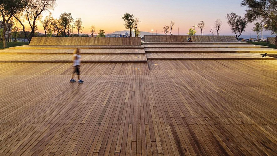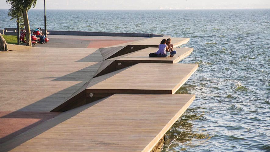Karşıyaka’da doğrudan batıya bakan birkaç kıyıdan birinde yer alan ‘Bostanlı Gün Batımı Terası’, ağaçlarla kaplı yapay eğim ve toprak set arasında davetkâr bir alan oluşturuyor. Gün batımı terası da yine Novawood tarafından temin edilen termal işlem görmüş Amerikan dişbudak ağacından imal edilmiş tahtalarla kaplı. Yüzey geometrisinin sadeliği ve akıcılığı, alandan faydalananları gün batımı ve denizle daha doğrudan bir ilişki kurması yönünde teşvik ediyor.