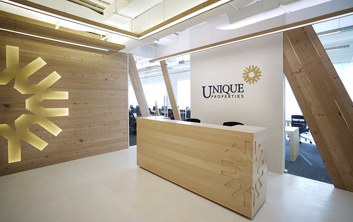 Guelaff tarafından yapılan açıklamaya göre, Unique Properties sahipleri, sadece kendi lojistik ihtiyaçlarını karşılayan bir ofis değil fakat çok daha önemlisi, çalışanları için modern bir kent ortamı sağlayan cesur bir mekan tasarımı istediler. Guelaff’ın bu istekler doğrultusunda yarattığı tasarımda, ofisin girişinde, 7 metrelik Amerikan ak meşeden yapılmış olan ve üzerinde 2.5 metre yüksekliğindeki kesme şirket logosu bir duvar ziyaretçileri karşılamak üzere yerini aldı. Ofis içinde benzersiz bir şekilde özel alan sağlayan cam bölmelerin tümünün önünde bulunan beyaz meşeden yapılmış açılı ahşap kaplama ise bir anlamda ‘ağaç ev’ etkisi yarattı. Buna ek olarak, tüm çalışma yüzeyleri Amerikan dişbudağından üretildiler ve ahşabın açık renklerini koruyan bir mat kaplamayla tamamlandılar. Dişbudak ağacı, çalışma alanına büyük bir doğallık hissi kazandırırken, ak meşenin öz suyundaki açık renkle birbirini tamamladılar.
