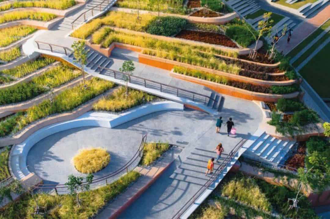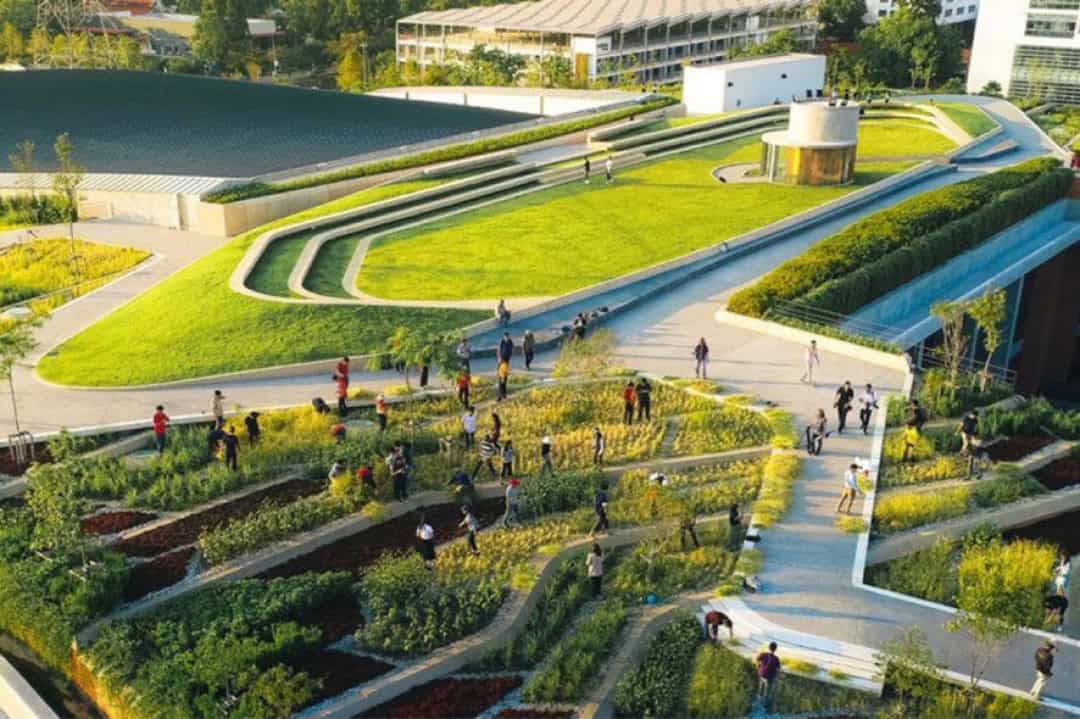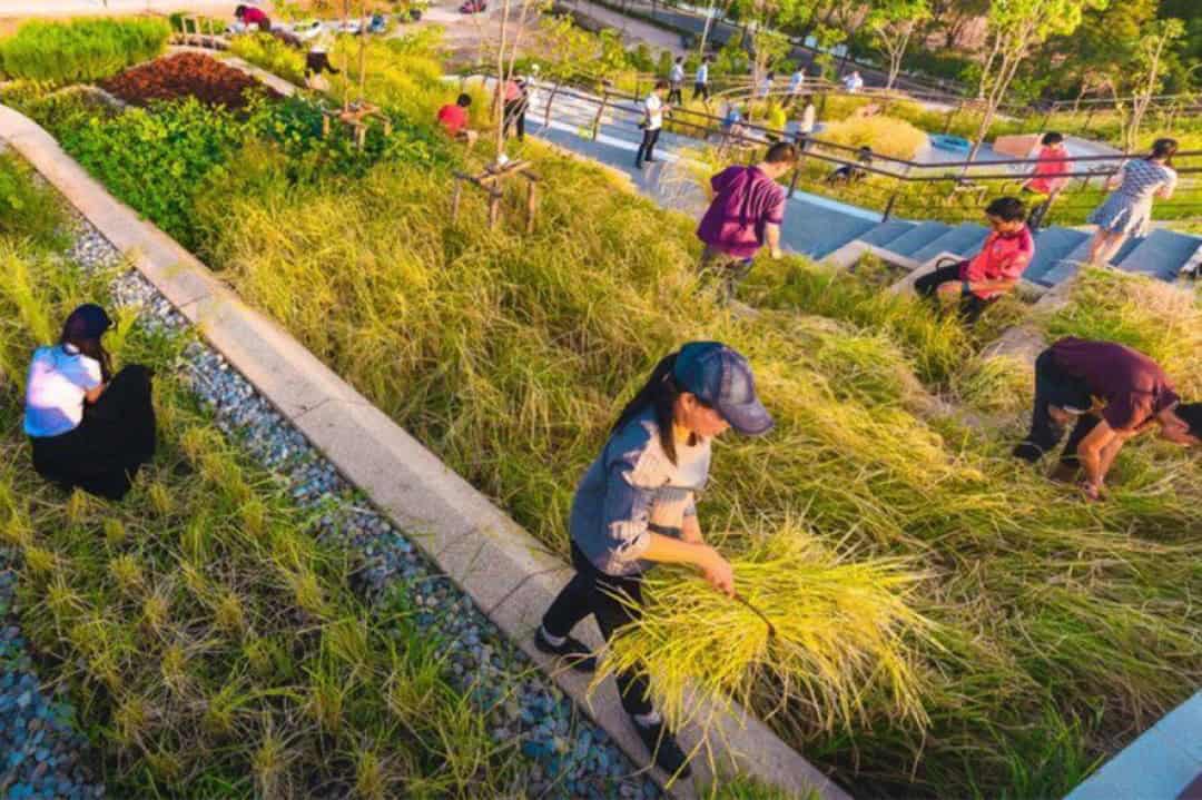 Bangkok alt bölgesi Bowon Niwet’te bulunan TURF’un pirinç teraslarının toprak işçiliğini modern yeşil çatı teknolojisi ile birleştiren zikzak teraslı tasarımı, Güneydoğu Asya’da bulunan geleneksel tarım uygulamalarından ilham alıyor. Basamaklı teraslar yalnızca farklı ekin alanlarını düzenlemeye yardımcı olmakla kalmıyor, aynı zamanda yağmur suyunu geleneksel beton çatılardan 20 kat daha etkili bir şekilde toplamayı sağlıyor. Toplanan yağmur suyu toplam 3 milyon galondan fazla su tutma kapasitesine sahip dört tutma havuzunda toplanıyor.