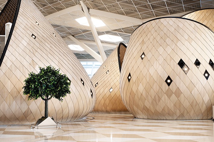 Organik forma sahip cocoon’ların kabuk yapılarında ahşap malzeme ile birlikte organizma strüktüründen yola çıkıldı. Malzeme seçimi itibariyle havalimanının teknik gereklilikleri içerisinde ‘şaşırtıcı’ ve ‘beklenmedik’ hisler uyandıran cocoon’lar için, aynı zamanda insan algısında duygusal bir yakınlık yaratmaları amacıyla özel bir doku tercih edildi. Deneysel ve ilerici bir tasarım yaklaşımının sonucu olarak insanda keşfetme duygusunu tetikleyen cocoon’ların, temel tasarım metodları ve geleneksel malzemelerle uygulanabilir kılınması, içerik, teknik, kapsam ve ölçek olarak projesinin en inovatif taraflarından biri oldu.