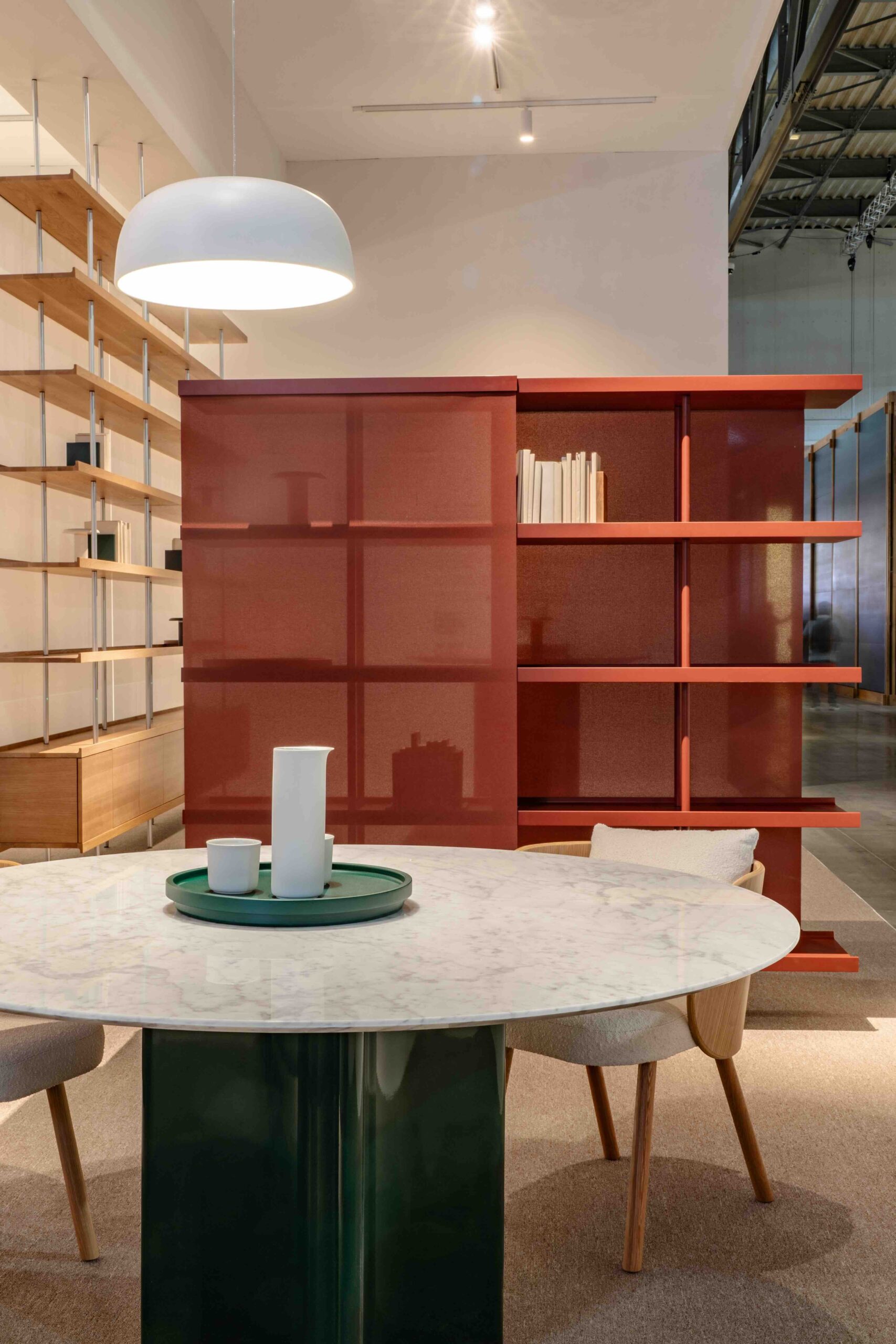 Metal dikmelerin oluşturduğu ritmik yapı, farklı yüksekliklerde konumlandırılabilen ahşap raflarla birleşerek esnek bir sistem oluşturuyor. Bu sistem duvara sabitlenebiliyor, tavandan askılı çözümler sunabiliyor, bağımsız bir eleman olarak mekânda konumlanabiliyor
