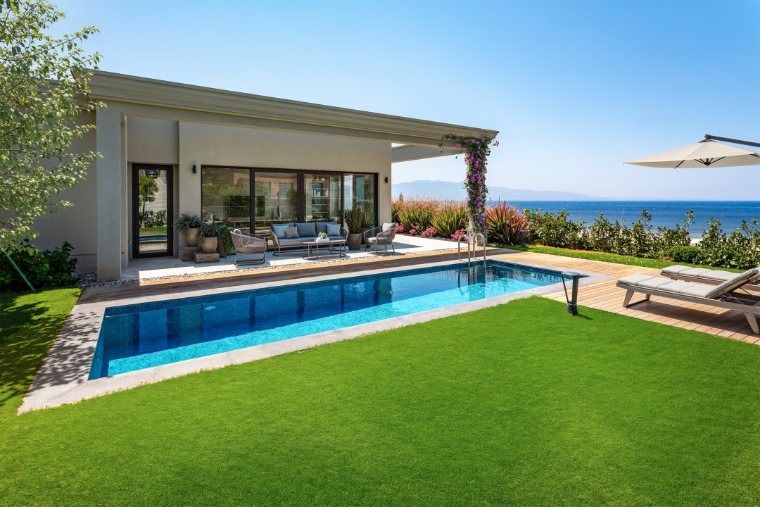 Mavi Arya’daki 3+1 daireler, özel bahçeleriyle öne çıkıyor. Toplamda 415 m²’ye ulaşan bahçe alanı ve tamamen daireye ait özel havuz, yaşamı doğayla kesintisiz bir şekilde buluşturuyor. Burada hissedilen şey kısa süreli bir tatil değil; kök salınan, gerçek bir ev duygusu. Bu dairelerin en güçlü yanlarından biri, tüm odalardan kesintisiz deniz ve Yunan adaları manzarası sunması. Salon, mutfak ve tüm odalardan bahçeye doğrudan çıkış bulunuyor. Yatay mimari sayesinde alan hissi daha da güçleniyor, manzara evin her noktasında yaşamın bir parçası haline geliyor.
