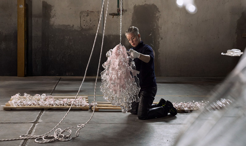 Şişecam’ın deneyimli cam ustalarıyla yürütülen ortak üretim sürecinde, geleneksel kalıplar bir kenara bırakılarak sanatçının yönlendirmesiyle sıcak cam özgürce şekillendirildi. Bu kolektif üretim sürecinde serbest üfleme tekniğiyle doğaçlama formlar yaratan ustalar, camın sadece endüstriyel bir malzeme değil, aynı zamanda sanatın güçlü bir anlatı aracı olduğunu bir kez daha ortaya koydu.