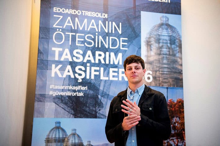 ‘Zamanın Ötesinde Tasarım Kâşifleri’ etkinliği kapsamında Geberit’in davetlisi olarak İstanbul’a gelen çağdaş sanatın dünya çapındaki en önemli temsilcilerinden Edoardo Tresoldi, mimarinin unsurlarıyla doğal unsurları birlikte kullanmayı sevdiğini söyledi. Erken dönem Hıristiyan kilisesi olan ‘Basilica di Siponto’yi tamamen el işi tel örgüler kullanarak ayağa kaldırdıklarını söyleyen Tresoldi; çalışmalarında bir heykeltıraş olarak mimarinin lisanını kullanmaya başladığının altını çizdi.