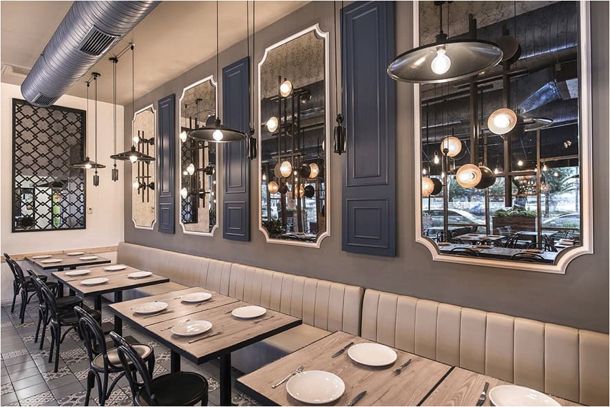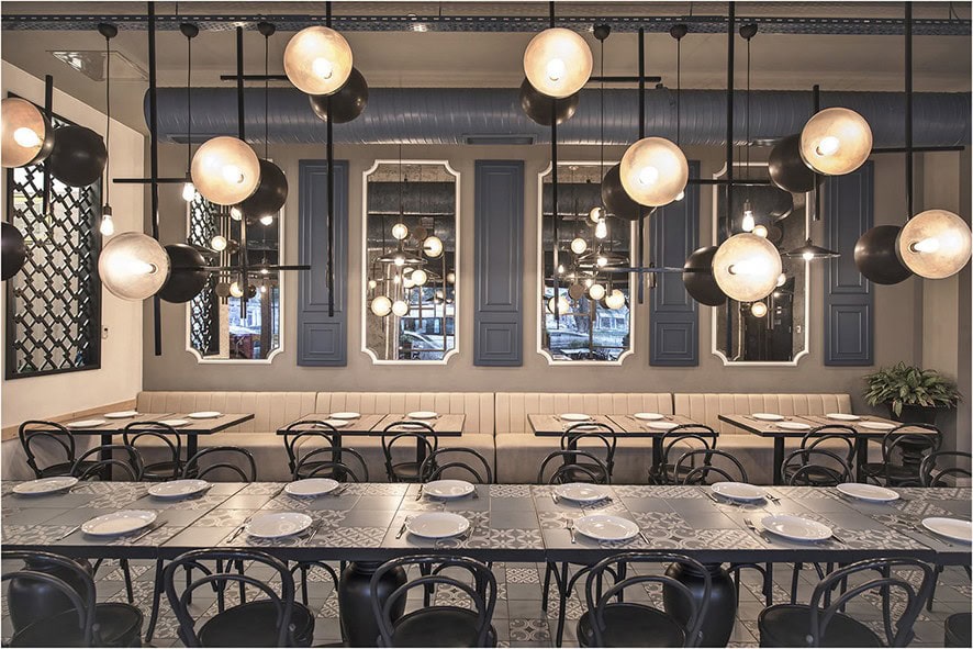 150 m2’lik restoranda kullanılan gök mavisi karo çiniler, çini renkleriyle uyum sağlayan pastel sarı renkler, eskitme aynalar, geçmiş mimari akımlara göndermelerde bulunan duvar çıtaları, ihtişamlı özel tasarım bronz aydınlatmalar ve lokanta kültürüne eşlik eden koyu renkli thonet ahşap sandalyeler, tarihsel bağlamın iç mekanlardaki yansımaları olmuş.