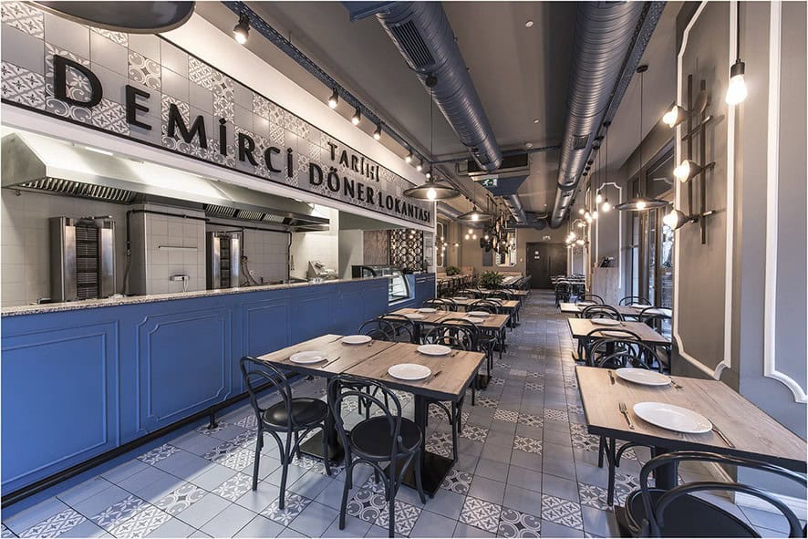 Geçmişin ruhunun, restoranın girişinden itibaren mekanın tüm detaylarıyla pekiştirilerek stilize edildiği Tarihi Demirci Döner Lokantası’nda eklektik tasarımı tamamlamak için gök mavisi geleneksel karo çinileri modern bir yaklaşımla yorumlanarak düzensiz bir dizilimle döşenmiş. Yine döşemedeki karo çinilerin masa yüzeyinde de kullanılması ve tavanda açık tesisat sisteminin muhafaza edilmesi eklektik tasarımın tamamlayıcı öğeleri olmuş.  Elektrik tavaları ve havalandırma kanalları da mekanda kullanılan gök mavisi renk ile boyanarak bütünlük sağlamış.