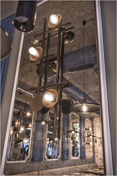 Geleneksel görünümü modernize edebilmek ve asimetrik dağılımlı doğramalar ile dil birliği elde edebilmek amacıyla duvarlarda beton grisi renk kullanan Caglayan Architects, restoranın merkezinde konumlandırılan görkemli aydınlatmanın, iç mekandaki modern ve geleneksel armoninin ve restoran kimliğinin özeti olarak öne çıkarıldığını belirtiyor. Tüm uygulama detayları düşünülerek ve mekanın ruhu gözetilerek Caglayan Architects tarafından tasarlanan aydınlatma ünitesi, oksitlenmiş eskitme bronz çanaklar ile lineer formda birbiriyle kesişen dikmelere ankre edilerek özenle imal edilmiş.