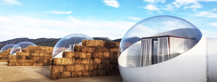 Ziyaretçilerine sürükleyici bir glamping deneyimi yaşatan otel, Amerika’da üzüm bağlarının arasına kurulmuş ve sert iklime dayanıklı şekilde tasarlanmış. Odaları iklim kontrollü özel sistemlerle kurgulanmış olan Campera’nın balonları, Fransa’da özel olarak tasarlanmış. Doğa ile etkileşimin maksimum derecede olduğu otelde odalar üzüm bağlarına bakan bir sırada dizilmiştir. Teknik olarak çadırda konaklamanın unutulduğu odada mavi gökyüzü ve manzara ile gerçeklik hissi yaşatılıyor. Basınçla hava sisteminin sağlandığı iç mekânlarda mahremiyet gölgelik perdelerle sağlanabiliyor aynı zamanda iklim kontrolü özelleştirilerek kişisel tercihlere bırakılıyor. Aydınlatma sisteminin de özenle düşünüldüğü balonlarda geceleri farklı renk ayarlarıyla gökyüzü seyredilebiliyor. Campera Hotel, glamping deneyimini ultra lüks kavramıyla buluşturan epik bir konaklama mekânı.