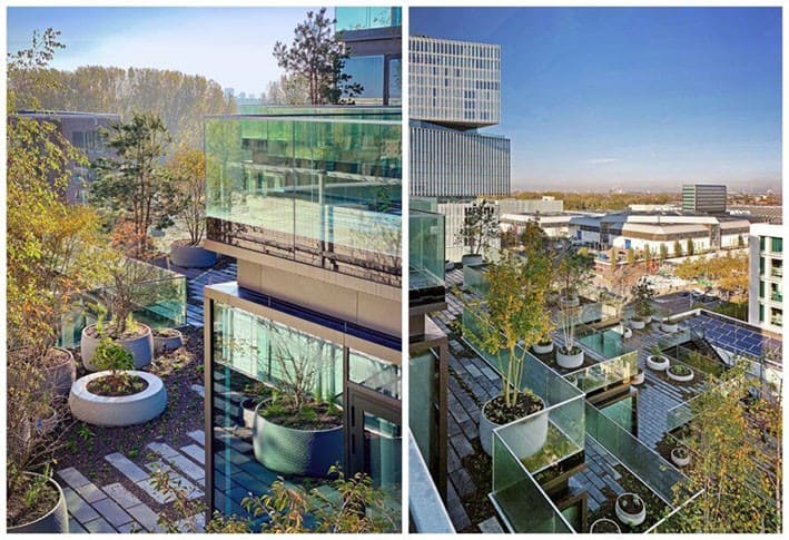 Terrace Tower Amsterdam binası, yeşil çatıları ofis binası tasarımının ayrılmaz bir parçası haline getirmeyi ve ofis çalışanlarına yeşil açık alanlar sağlamak amacıyla tasarlandı.