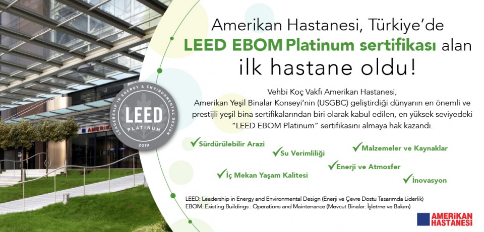 Vehbi Koç Vakfı Sağlık Kuruluşları çatısı altında yer alan Amerikan Hastanesi, çevre dostu bina sertifikasyon sistemi olan “LEED EBOM (Existing Building: Operations and Maintenance) Platinum” sertifikasının sahibi oldu. Amerikan Hastanesi, “LEED EBOM Platinum” sertifikası alan Türkiye’de ilk ve tek, dünyada ise bu kapsamdaki en büyük alana sahip tam teşekküllü hizmet veren ilk hastane oldu.