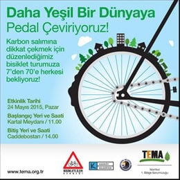 24 Mayıs’ta ‘Daha Yeşil Bir Dünyaya Pedal Çeviriyoruz’ etkinliği düzenlenecek. Karbon salımına dikkat çekmek için Kadıköy Belediyesi, Kartal Belediyesi, Bisikletliler Derneği ve TEMA Vakfı İstanbul 1. Bölge Sorumluluğu’nun birlikte düzenleyeceği 500 bisikletlinin katılacağı etkinlik, saat 11.00’de Kartal Meydanı’nda başlayacak saat 14.00’te Caddebostan sahilinde sona erecek.