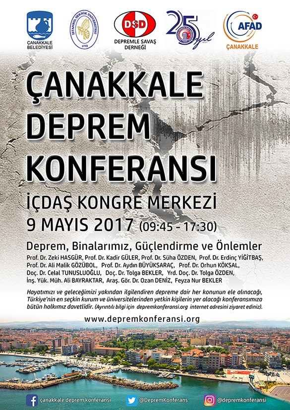 İstanbul Teknik Üniversitesi, Çanakkale Belediyesi, Çanakkale Onsekiz Mart Üniversitesi, Depremle Savaş Derneği ve AFAD-Çanakkale’nin katkılarıyla 9 Mayıs 2017 Salı günü Çanakkale’de “Deprem, Binalarımız, Güçlendirme ve Önlemler” konulu bir konferans gerçekleştirilecek.