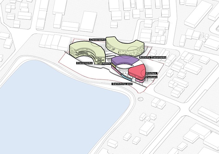 Chris bosse, yönetmen LAVA, “Tasarım dili olan organik şekiller, basit mimari çizgiler, ana renkler, yaşa göre kodlanmış farklı cepheler/pencereler, tamamen büyüme ile ilgilidir. Çocukça olmadan çocuk dostu olayı ifade ederler. Gelecek nesiller için olan bu eğitim projesi, şu zamana kadar süregelen eğitme ve öğrenme yollarımızı sorgulamamıza sebep oluyor. Önünde öğretmen, sıralarda çocukların dinlediği steril bir kutu yerine, çocukların bütünsel gelişimini desteklemek için keşfetme, merak, doğa ile etkileşim ve aktiviteye dayalı öğrenmenin teşvik edildiği bir öğrenme ortamı yarattık. Bu vizyon, doğaya ve dünyanın eğlenceli keşfine ilham veren yapısal geometrilerine dayalı bir tasarım dili aracılığıyla gerçekleştirilir.” diyor.