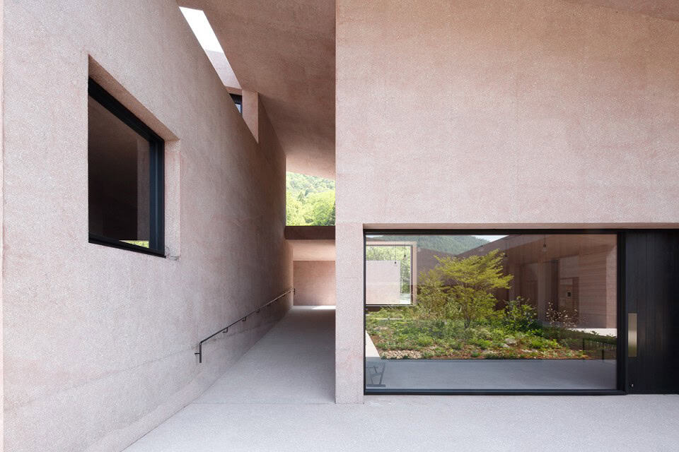 Ziyaretçi merkezine dışarıdan doğrudan ya da bahçedeki rampada erişilebilen koridorlardan ulaşılabiliyor. Minimum derecede ısıtma sistemleri ve suni aydınlatmalar içe çalışılmış iç mekanlarda sessiz sade formlu malzemeler ve mobilyalar ile zamanın ritmi uzaklaştırılmış ve ziyaretçilerin inzivaya çekilmeleri için uygun mekan anlayışı yaratılmış.