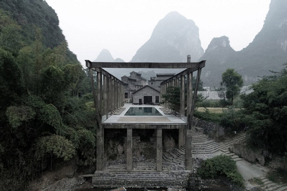 Vector Architects, Çin’in dağlık bölgesi Yangshuo’da kullanılmayan bir şeker fabrikasını endüstriyel mimariyi tamamyacak şekilde tasarlayarak, bir grup duvar örgüsüne sahip turistik bir otele dönüştürdü.