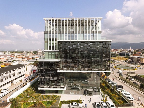 Yüksek niteliklere sahip bir çalışma ortamı oluşturmanın çok önemsendiği EWE & Bursagaz Merkez Ofisi’nde ofisin çevresini gölgeleyerek saran dış cephe kaplaması tercih edilmiş. Cephe kaplamasının bir yüzeyi modüler BIPV panelleriyle, diğer yüzeyi ise gölgelendirmede kullanılan boyalı camlarla kurgulanmış. EWE & Bursagaz Merkez Ofisi’nde gölgelerinin oluşturduğu düzensiz bir ritimle ışık kontrollü ve konforlu iç mekanlar hesaplanarak, titizlikle oluşturulmuş.