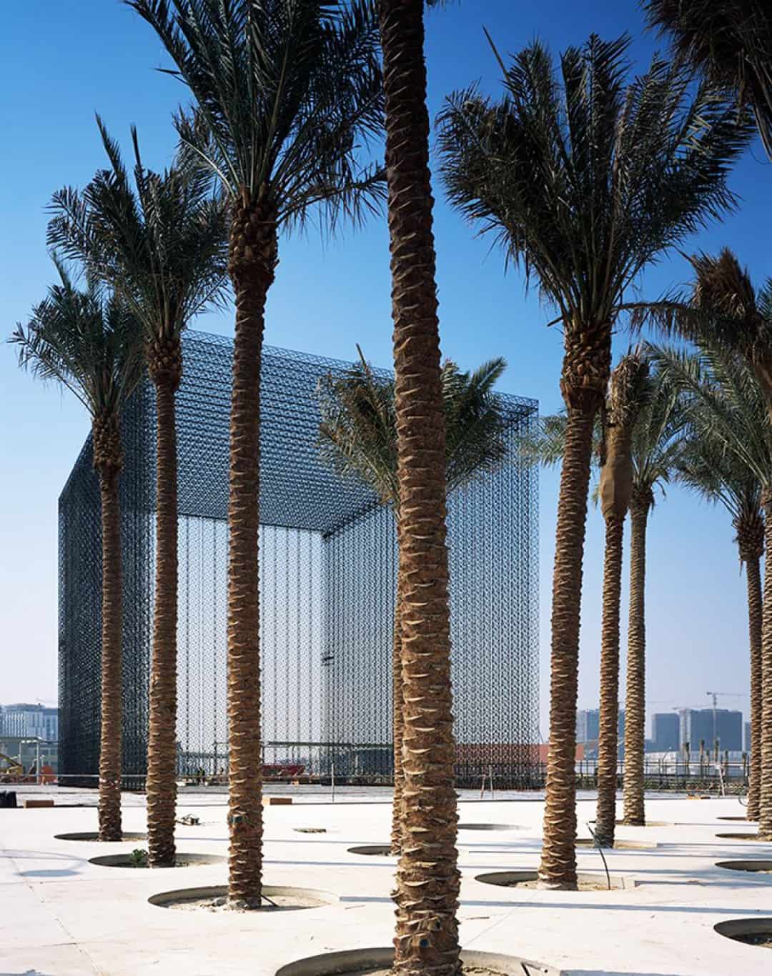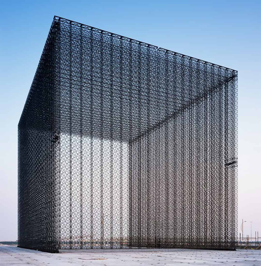 Gelen ilk görüntülerde Asif Khan’ın, expo 2020 dubai giriş portalları için bölge genelinde ışık ve hava akışını düzenlemek için kullanılan karmaşık bir tasarım olan geleneksel mashrabiya’nın fütüristik bir uyarlamasını sunduğunu görüyoruz. Birbirlerine birer dantel motifi gibi bağlanan siyah renkli küpler, yakından bakıldıkça daha fazla ışık veren gizemli, karanlık boşluklar yaratıyor. Gökyüzünde oldukça detaylı bir duvar resmi gibi görünen kapıların fuar alanına yansıyan gölgesi de misafirleri, ilhamını yerel kaynaklardan almış eğlenceli bir mimari anlayışıyla karşılıyor.