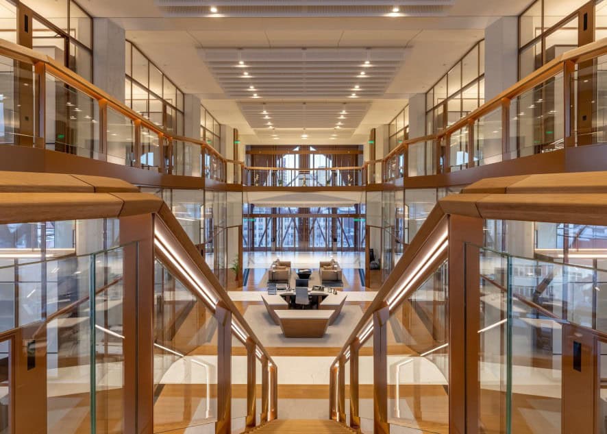 Ofis düzeni, ‘çalışanlar için bir ev’ düşüncesiyle tasarlanmış. Odalar ve alanların daha samimi ve ev ortamı yaratılma düşüncesiyle tasarım geleneksel ortak çalışma alanlarından ayrılıyor. Her iki katlı modül üst üste konumlandırılmış bir çift ofisten oluşur. Bu, çift katlı kaplama modülü ile harici olarak ifade edilir. Modüller, salon oturma alanı ve camlı asansör boşluğundan şehir manzarası ile ara boşluk olarak işlev gören merkezi bir koridorun her iki tarafında sıralar halinde düzenlenmiştir.