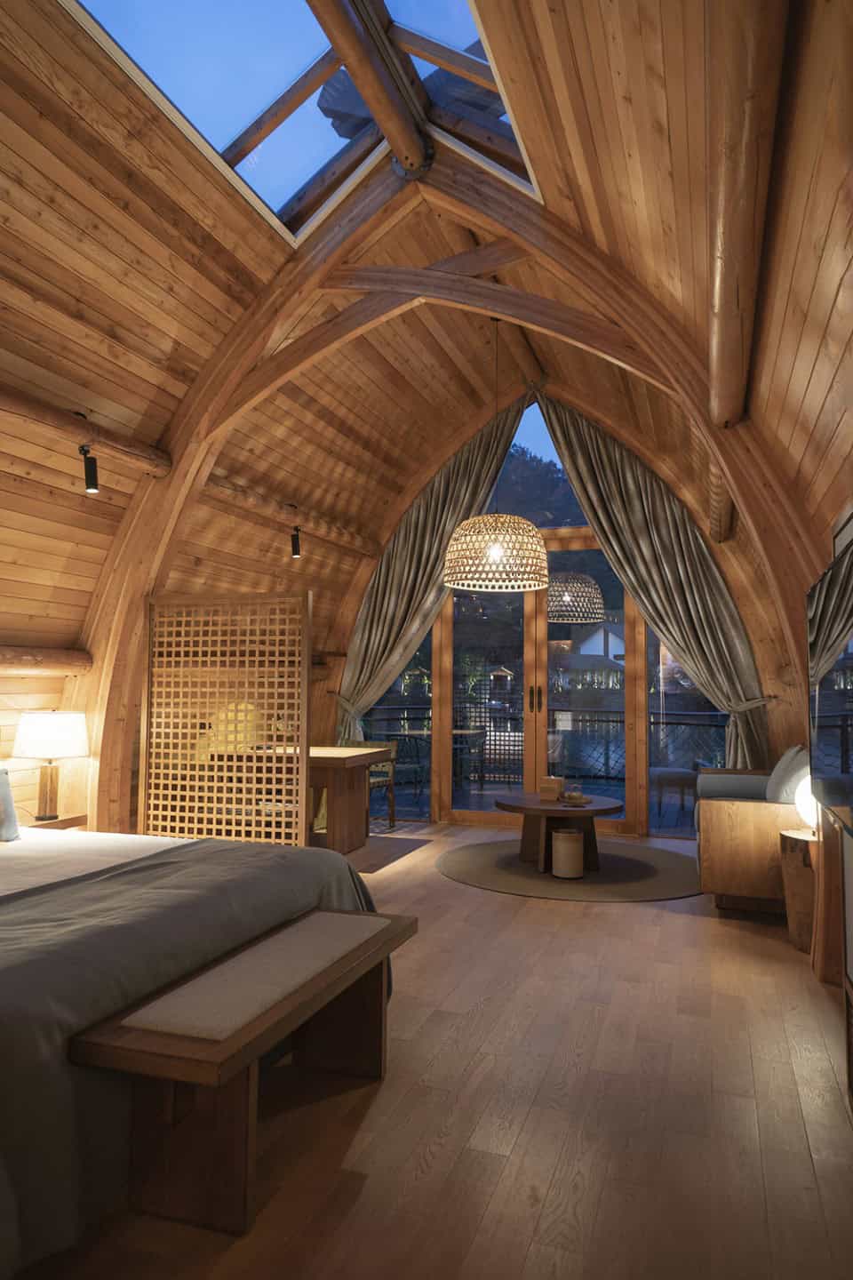 Her bir odanın kemer biçimli yapısı mekanın tekne formuna doğal yönelim sağlarken mekanların düzenini ve ritmini de ortaya çıkartıyor. Yapısal mantık ve dekorasyonu birleştiren bu tasarım yöntemi tekne odasının estetiğini ve mekansal gücün de bir göstergesi oluyor. Tekne odalar, misafirleri için mavi ve dingin bir gölün ortasında doğanın seslerine ve akışına ayak uydurulan huzurlu bir dinlenme alanı.