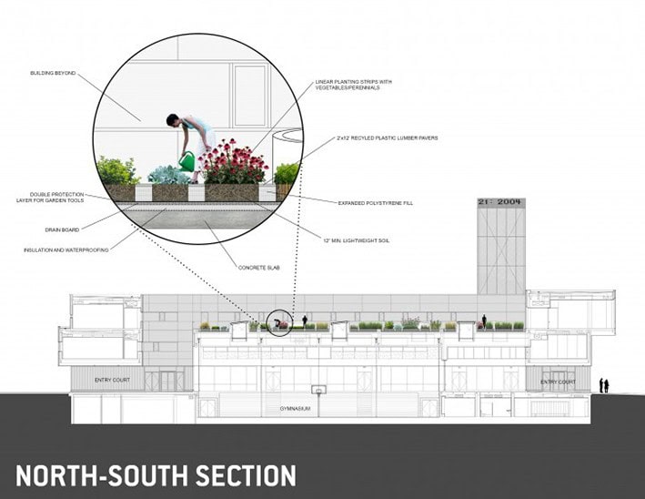 Gary Comer Gençlik Merkezi, güvenli dış ortamlara veya taze ürünlere çok az erişimi olan Chicago’nun güneyindeki Grand Crossing’de yer alıyor. Hoerr Schaudt Peyzaj Mimarları, her yıl 450 kilo organik meyve ve sebze üreten, aynı zamanda çocuklara kendi sağlıklı yiyeceklerini nasıl yetiştireceklerini öğreten 8,160 metrekarelik, 60 cm derinliğinde bir eğitim bahçesi tasarladı. Çatıda yetiştirilen organik ürünler, gençlik merkezinin kafesinde her gün 175 öğrenciye servis ediliyor.