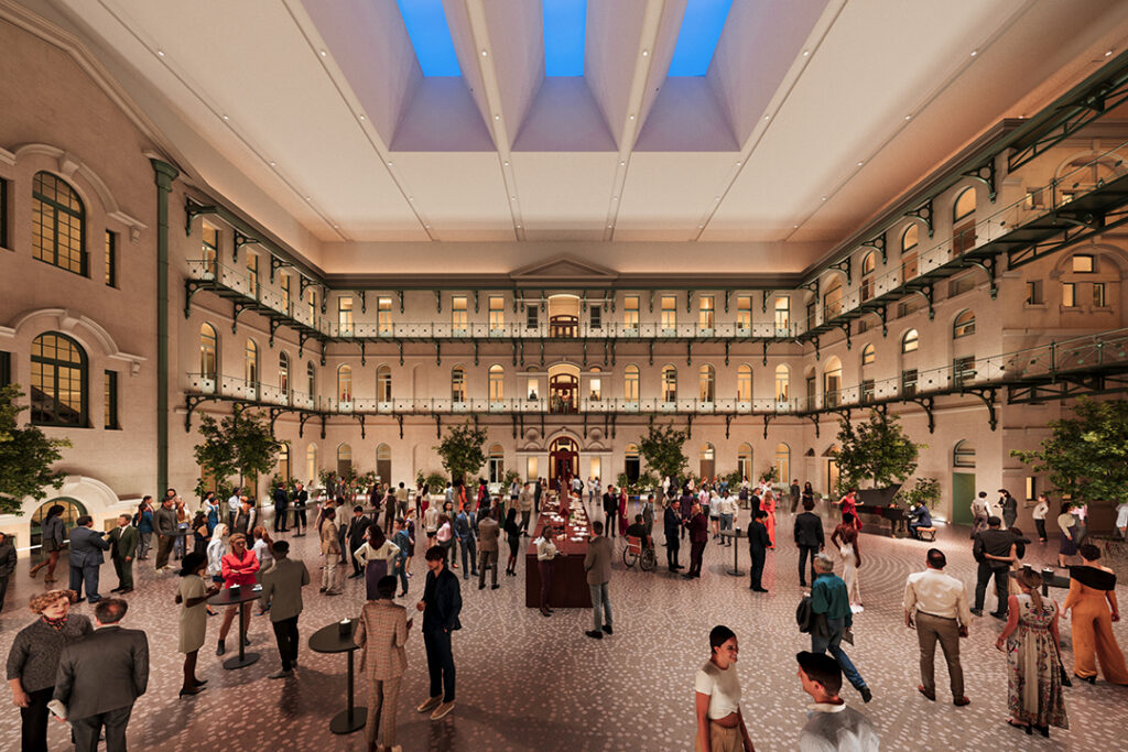 COX Architecture tarafından geliştirilen tasarımda, avluya doğal ışık sağlamak amacıyla üç büyük çatı penceresi (skylight) ekleniyor. Bu müdahale, yapının derinliklerine kadar gün ışığını taşıyarak daha sakin, dengeli ve davetkâr bir atmosfer yaratmayı hedefliyor. Aynı zamanda bu ışık elemanları, mevcut yapı sistemleriyle uyumlu şekilde yerleştirilerek estetik ve teknik gereklilikler arasında hassas bir denge kuruyor.
