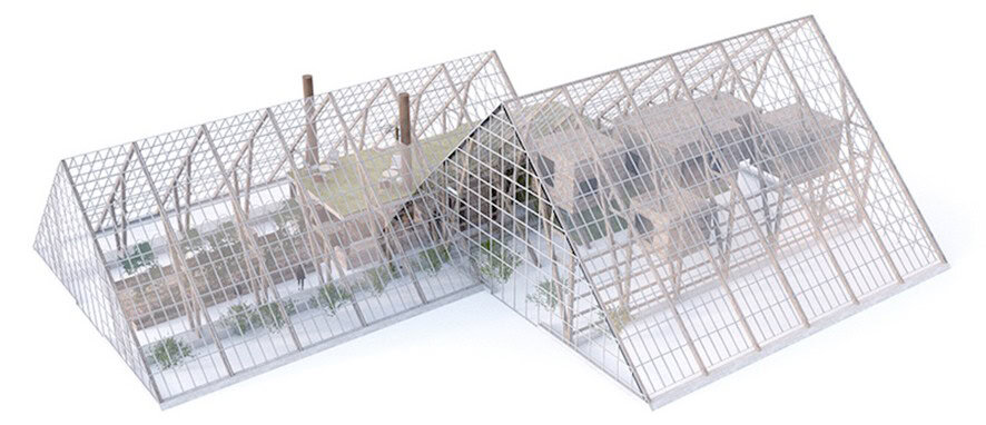 Projenin merkezi olarak kabul edebileceğimiz mekan, “üçüncü alan” denilen ve birbiriyle kesişen iki üçgen cam prizmadan oluşuyor. Misafirlerin de kesişim merkezi olarak planlanmış mekanda, çiftliğin restoranı ve kısmen dışarı açık bir mutfak bulunuyor. İnsanlar, hemen yanında konakladıkları gölden tutulmuş balıkları; içinde bulundukları çiftlikten veya ormandan gelen yiyecekleri burada tüketebilecek.