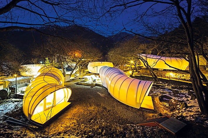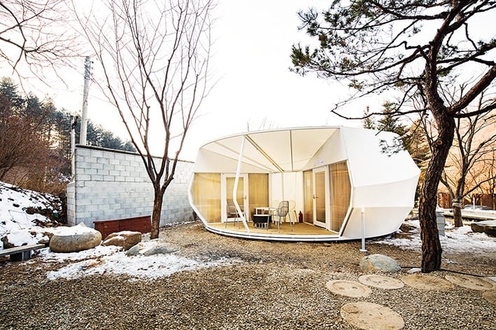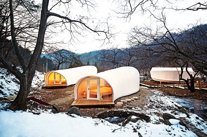 Güney Koreli mimarlık stüdyosu ArchiWorkshop tarafından tasarlanan “Glamping for Glampers”, dış mekânlarda rahatlık ve tarz deneyimini tercih edenler için eko-lüks bir konaklama alternatifi sunuyor. Çağdaş tasarımlı iki tip glamping biriminden oluşan yumuşak dokulu yapılar, doğanın ortasına konumlanmış vaziyette. Glamping; vadinin, ormanın ve akarsuyun manzarasını sunarken insanları doğaya yakınlaştırıyor ve benzersiz bir mimari deneyim yaşatıyor.