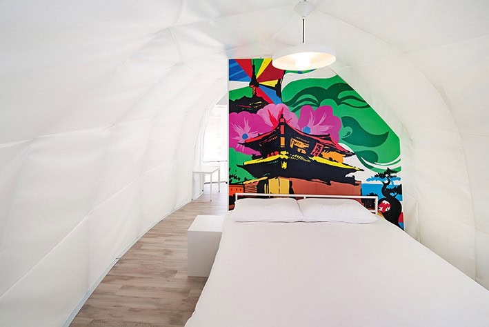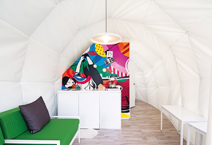 ArchiWorkshop tasarımı olan ‘Glampers için Glamping’ iki farklı şekilde çadırdan oluşuyor. Tasarımlardan biri engebeli araziye kolayca uyum sağlayan uzun, kıvrımlı bir formda. Bu çadırın katlanır mobilyaları özel olarak üretilmiş ve beyaz iç mekânları yerel bir sanatçı tarafından boyanmış. İkinci tasarım ise içi boş yuvarlak şekli ile bölgedeki çakıllara işaret ediyor ve küçük bir açık alanla tamamlanıyor.