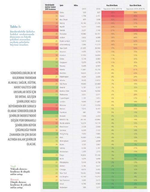 Sürdürülebilirlik ve kalkınma yakından alakalı: sağlık, eğitim, hayat kalitesi gibi unsurlar ikisi için de ortak. Gelişen şehirlerde hızlı büyümenin bir sonucu olarak Sürdürülebilir Şehirler İndeksi’ndeki düşük performanslı şehirlerin büyük çoğunluğu yakın zamanda en çok baskı altında kalan şehirler olacak. Bu da Tablo 1’de açıkça görülebilmektedir: tablonun üst yarısı hızlı büyüyen ancak göreceli olarak düşük sürdürülebilir şehirlerden oluşuyor. Tablonun aşağı yarısında ise büyümenin az olduğu ancak oldukça sürdürülebilir şehirler yer alıyor. Büyüme hızı ortalarda olan şehirlerde ise durum karışık, sürdürülebilirliği hem az hem çok olabilen şehirler görmekteyiz.