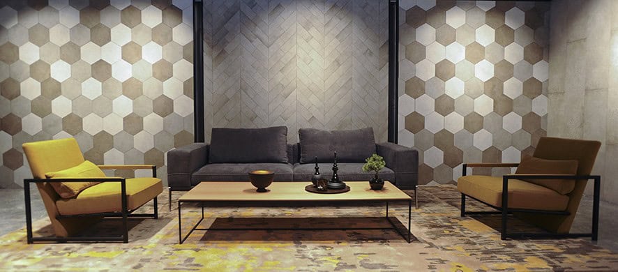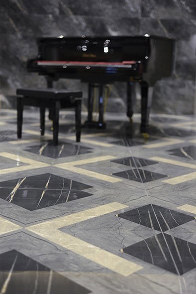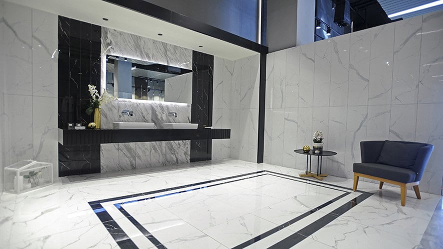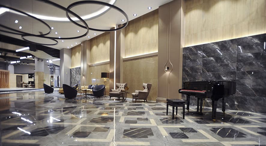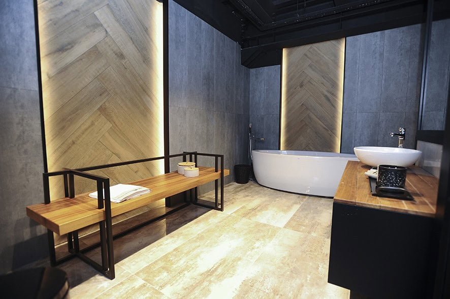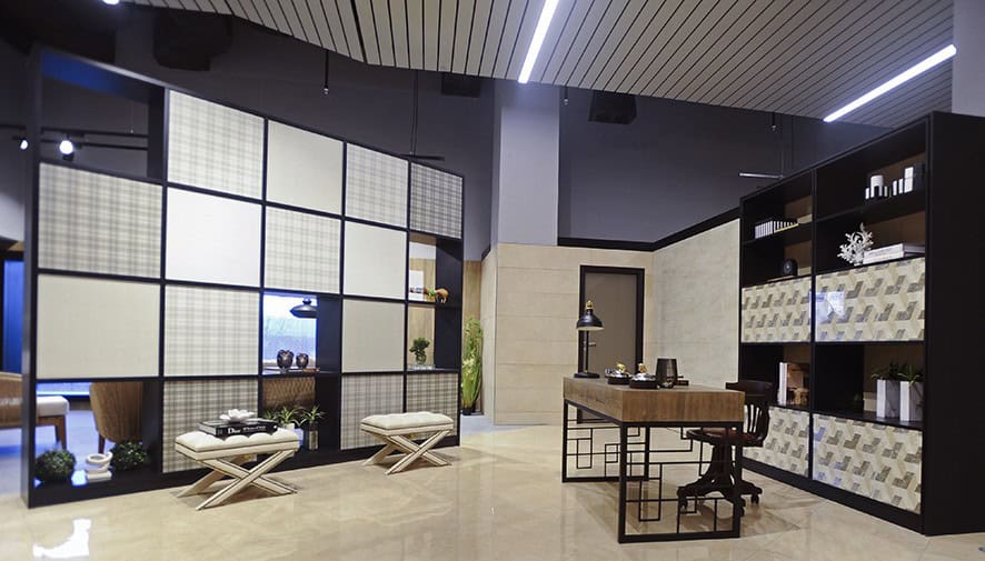Showroomun girişinde yer alan karşılama bankosu ve arka duvarı ile bekleme bölümü tasarımında, seramik karolar kullanılmış. Zeminde birbiriyle uyumlu renklerden oluşan seramik motifin, mermer hissi yaratması hedeflenmiş. Ziyaretçilerin konut konseptiyle karşılandığı showroomda, yatak ve giyinme odalarının yanı sıra; wc, ebeveyn ve genel banyo tasarımına örnek niteliğinde 4-5 farklı seçenek hazırlanmış. Açık ve koyu renkli seramiklerin yanında, ahşap ve mermer görünümlü karolarla, sıcak, samimi, yaşanılır mekanlar tasarlanmış. Kullanılan aksesuarlarda da, seçilen seramiklere uygun olarak, kahve, pirinç, krem, siyah, yeşil uyumu sağlanmış. Islak hacimlere ilave olarak bir de hamam düşünülmüş. Mutfak, oturma ve yemek odaları, çalışma odası ve şömine köşesi ile balkon da konut konsepti içine dahil edilmiş.