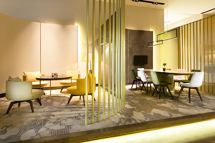 Gönye Proje Tasarım tarafından Park Mavera Satış Ofisi’nin tümünde kullanılan renk, doku ve aksesuarlar, mekandaki seçkin ve davetkar ortamı vurgulayacak şekilde kurgulanmış. Düşeyde kullanılan siyah mermer, oniks ve pirinç aksamlar ile modern bir görünüm elde edilirken, duvar kağıdı ve kumaş kaplama ile zeminde tercih edilen ahşap parke ve özel üretim halı kombinasyonuyla sıcak bir mekan algısı yaratılarak aynı zamanda olası akustik problemlere de çözüm getirilmiş. Kullanılan malzemeler dışında mekanın bazı bölümlerinde tercih edilen düşey akustik panellerle akustik konfor kuvvetlendirilmiş. Modern mobilyalardaki renk ve doku kullanımı mekanın bütünüyle uyumlu ahşap aksamlı, sarı-yeşil tonlarının hakim olduğu kumaş kaplamalarla hem satış ofis tasarımına uygun olarak, hem de rahatlıktan ödün vermeyecek şekilde özenle seçilmiş.