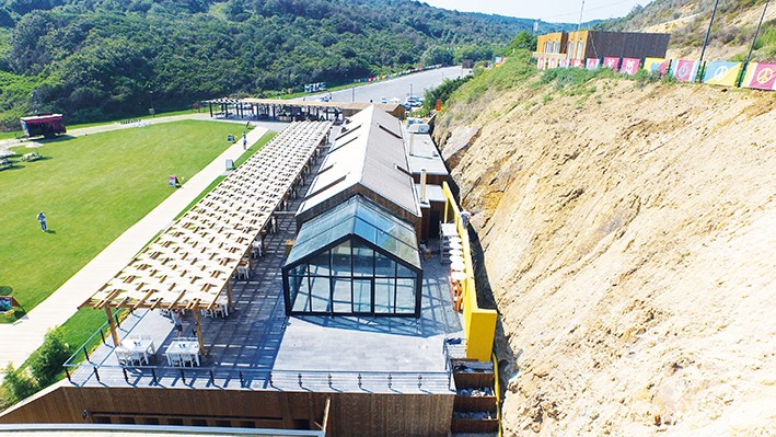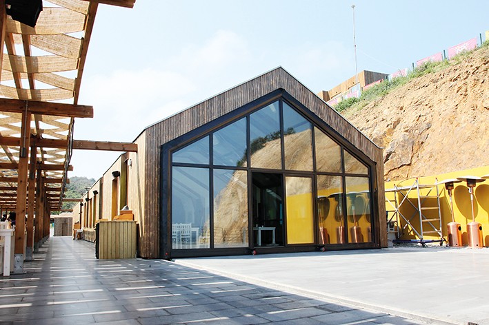 Ahşap strüktür ve kaplamalarla inşa edilen modern restoran binası, koyun deniz manzarasına hakim noktasında yer almaktadır. Proje; deniz kenarındaki konumu, yaz ve kış aylarında karşılaşılan güçlü hava şartları nedeniyle kullanılan malzemeleri ve sürdürülebilirlik özellikleri ile önem kazanmıştır. Projede kullanılan, tarımsal atıklardan üretilen biyo-likitler yoluyla işlenerek dayanıklı hale getirildiği Norveç menşeli Kebony marka ahşap, kompleks genelinde kullanılmış olan kaplama malzemesi olarak istenen doğal görünümün sağlanmasında rol oynamıştır.