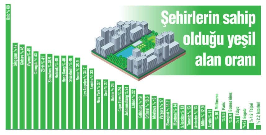 Dünya şehirleriyle ilgili istatistiksel raporlar yayınlayan World Cities Culture’ın son raporunda İstanbul, sahip olduğu yüzde 2.2’lik yeşil alan oranıyla 37 şehir arasında son sırada yer alıyor.