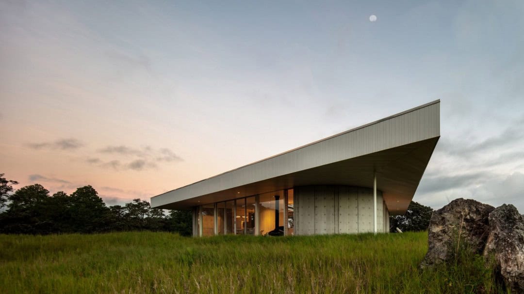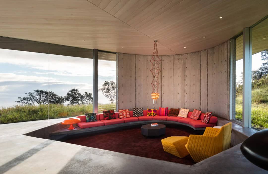 100 dönümlük yuvarlanan çimenli tepelerle çevrili olan ev Büyük Ada, Paauiro’daki Mauna Kea yanardağının yamaçlarında kuzeye bakıyor. San Francisco stüdyosu Craig Steeley Architecture, “Sahipleri, Hamakua Sahili’nin rüzgarlı kır doğasını yansıtan bir ev istedi. Alçak çatı kareydi, ancak yaşam alanı yuvarlaktı.” diyor. Üçgen bir düzlemde düzenlenmiş.