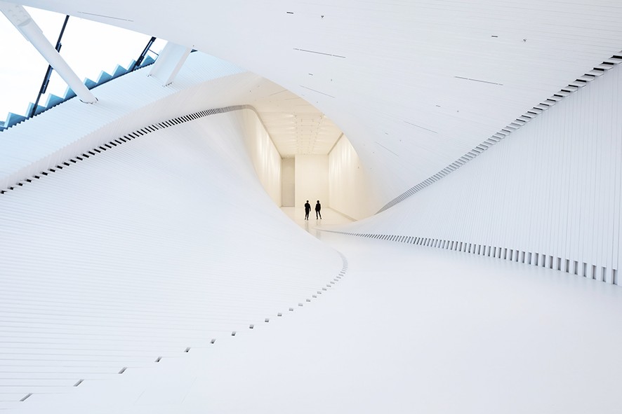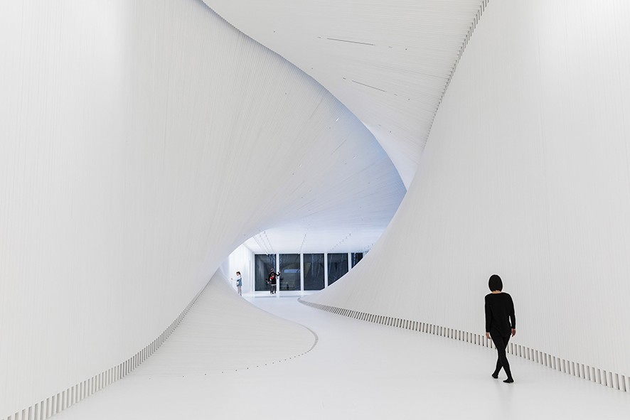 İç kısımdaki kıvrılma iki sergi alanı arasında boşlukların dönüşümüne aracılık eden, kabuğa benzer bir geçit oluşturuyor. Köknar ağacından yapılmış ve beyaza boyanmış çıtalarla kaplanmış iç alan, sanat eserlerine yalın bir fon sağlıyor.