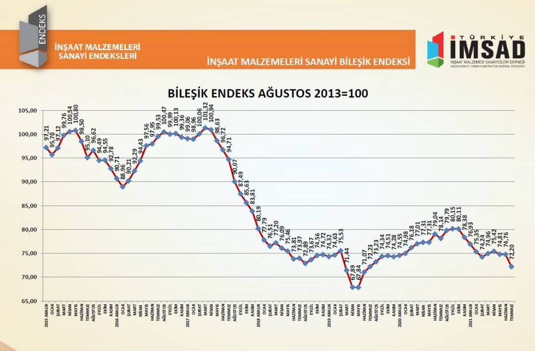 Türkiye İMSAD tarafından hazırlanan İnşaat Malzemeleri Sanayi Bileşik Endeksi, temmuz ayında uzun tatil günlerinin etkisi ile son ayların en sert düşüşünü kaydetti. Bileşik Endeks, 2,56 puanlık kayıpla 72,20 puana geriledi. İç ve dış talepteki küçülme bu dönemde belirgin şekilde hissedildi. Güven ve beklentiler tarafındaki düşüş eğilimi de sürüyor.