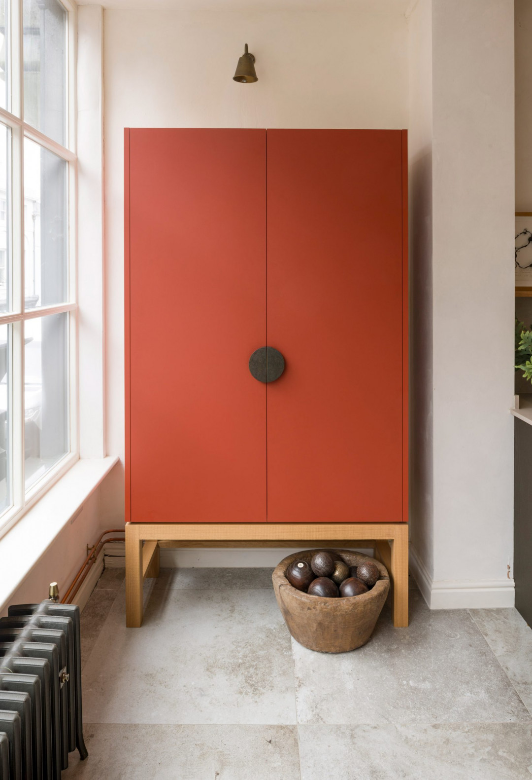 Inglis Hall’un yaklaşımında malzeme kalitesi, mobilyanın sürekliliğini destekleyen bir etken olarak ön plana çıkıyor. Doğal ahşap yüzeylerin ve detaylı işçiliğin kullanımı, dolabın mekânsal bağlamla güçlü bir ilişki kurmasına olanak tanıyor ve mutfakta depolama işlevinin mimarlıkla arasındaki çizgiyi bulanıklaştırıyor. Bu tasarım, mutfak içinde depolama elemanlarının yalnızca yardımcı unsurlar olmaktan çıkıp mekânın ana ritimlerinden biri olarak düşünülmesini amaçlıyor.