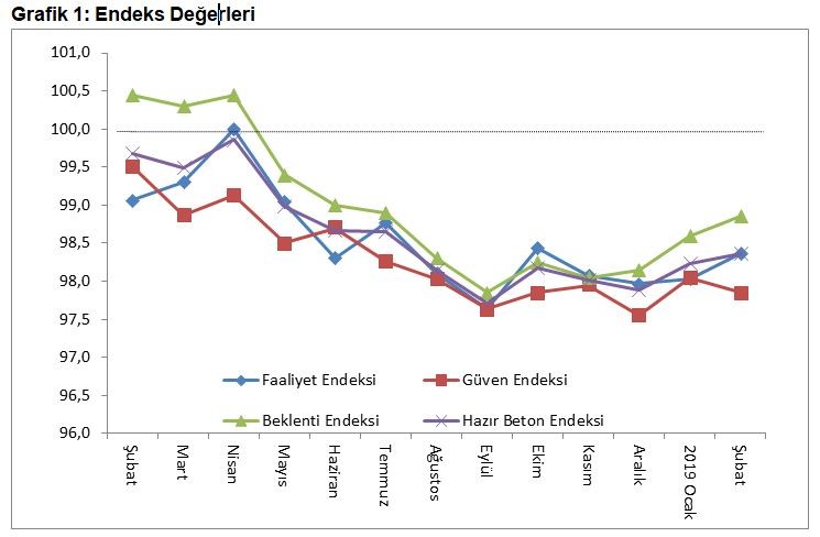Hazır Beton Endeksi 2019 Şubat Ayı Raporu’na göre 3 Endeks değeri de, önceki yılın aynı dönemine göre düşüş sergiledi. Bununla birlikte son 3 aydır faaliyetteki yavaşlamanın hızında düşüş görüldü. Hem beklenti hem de güven endeksinin geçen yılın aynı dönemine kıyasla -%1’in üzerinde düşüş göstermesi, önümüzdeki dönemde faaliyette mevsimselliğin ötesinde bir artış beklenmemesi gerektiği sonucunu ortaya koydu.