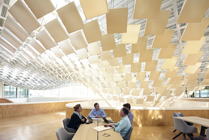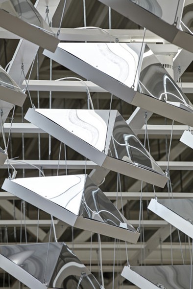 Ofis çalışanları gün içindeki doğal ışık değişimlerini özlerken bu hacimsel yansımalarla bu zaman değişimi hissi verilmeye çalışılmış. LAVA tüm yıl için doğal ışık senaryolarını oluşturmak için panelleri yapay zeka ile programlamış.
