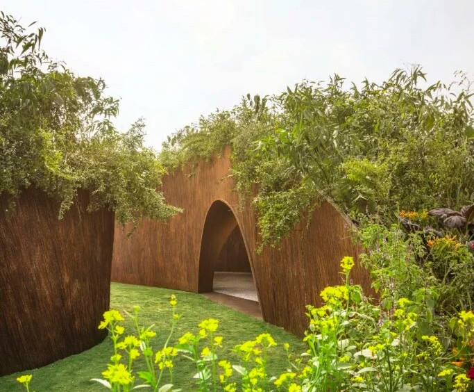 Pavyonun tavanında yer alan ve 40 yerli bitki türünden oluşan “mikro-habitat”, yapıyı sadece bir sergileme alanı olmaktan çıkarıp yaşayan bir organizmaya dönüştürüyor. Tıbbi ve kültürel önemi olan bu bitkiler, pavyonun sergileme süresi dolduğunda kentsel bahçelere nakledilerek ekolojik döngüye geri kazandırılacak. Lantana dallarının sağladığı doğal havalandırma ve ışık oyunları, mekana hem mistik hem de sürdürülebilir bir karakter katıyor. Oldukça ilginç bir ekolojik proje.