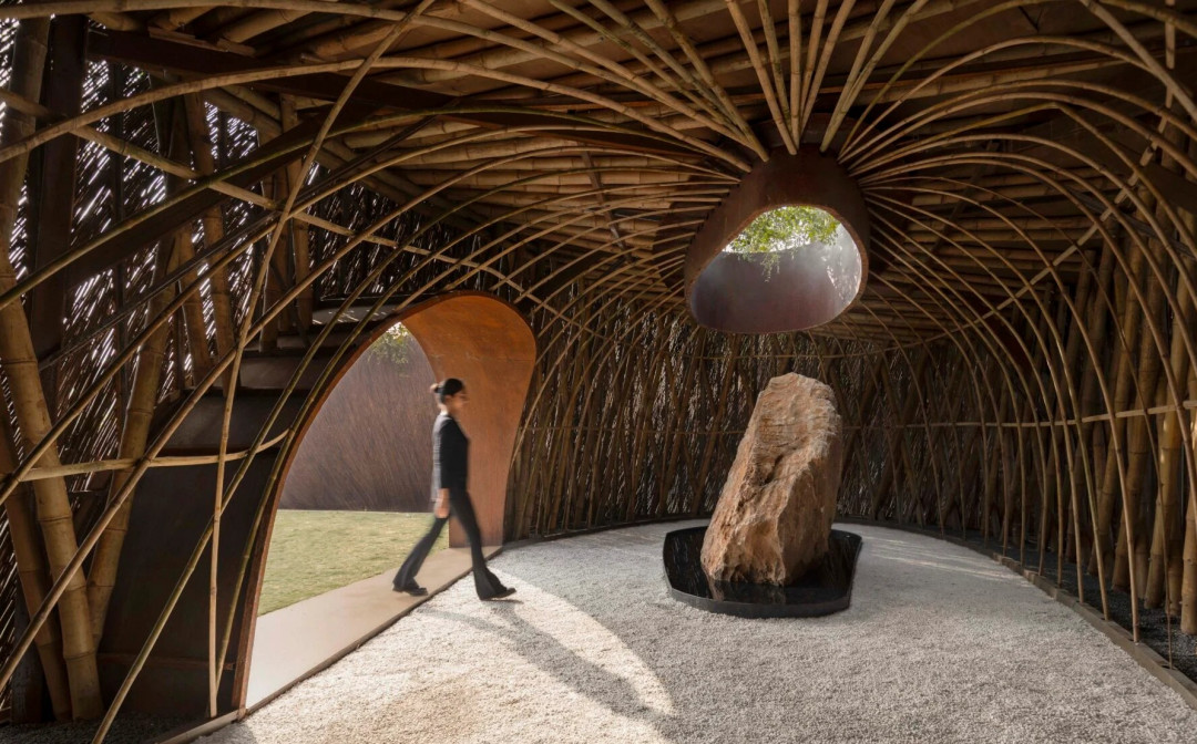 Londra merkezli TM Space stüdyosu tarafından tasarlanan yapı, “ilkel fütürizm” (primitive futurism) felsefesini takip ediyor. Mimarlar, yüksek teknolojili görsel betimleme (scripting) yazılımları kullanarak kurguladıkları karmaşık formu, sahadan elde edilen tamamen doğal biyomateryallerle inşa ettiler. Yapının spiral formu, Hindistan’ın antik kutsal koruluklarına ve oradaki mistik patikalara bir saygı duruşu niteliğinde. Ziyaretçi, geçirimli ve dokulu duvarların arasından merkeze doğru ilerlerken, mimari ve doğa arasındaki sınırların eridiği özgün bir yolculuğa çıkıyor.
