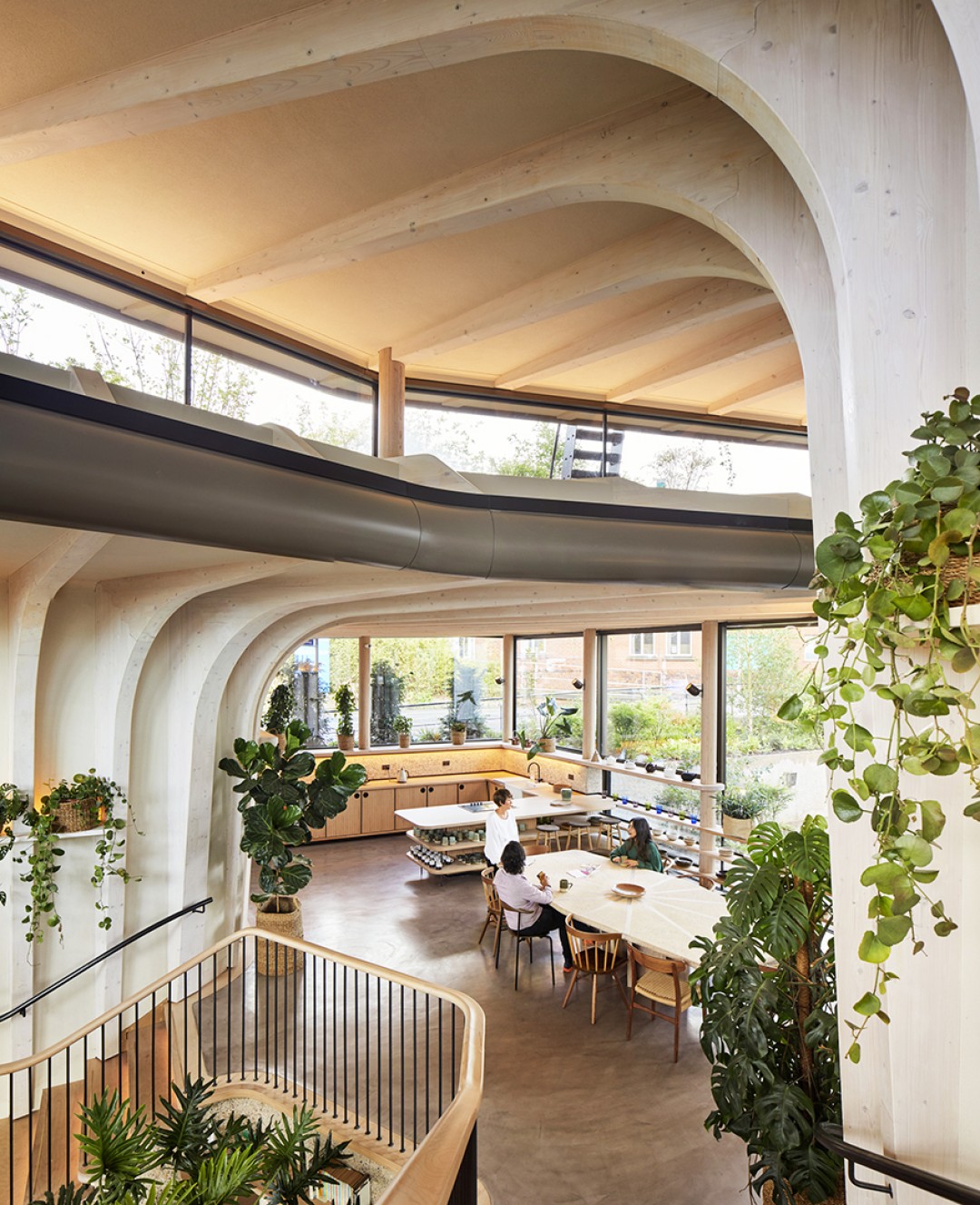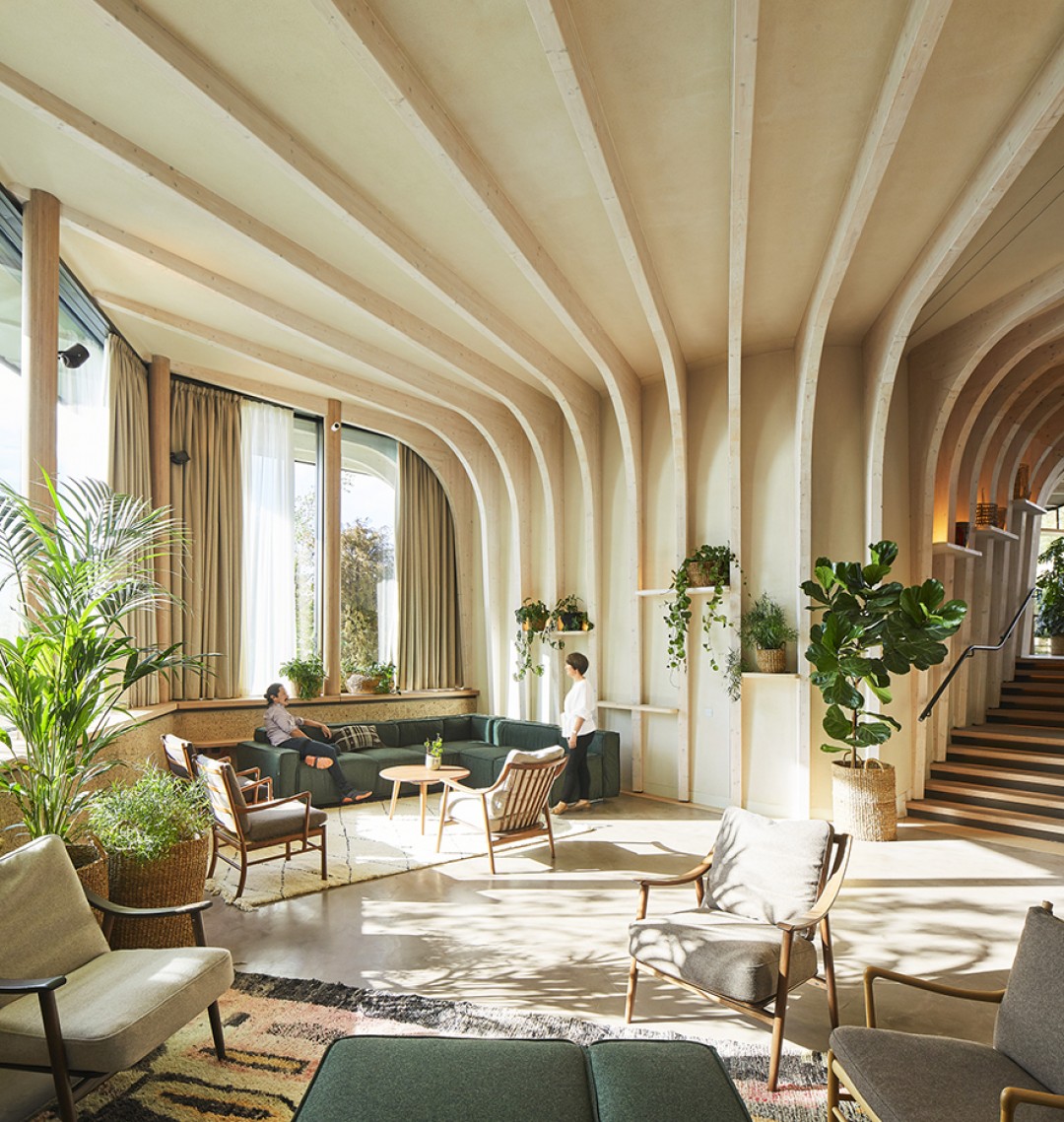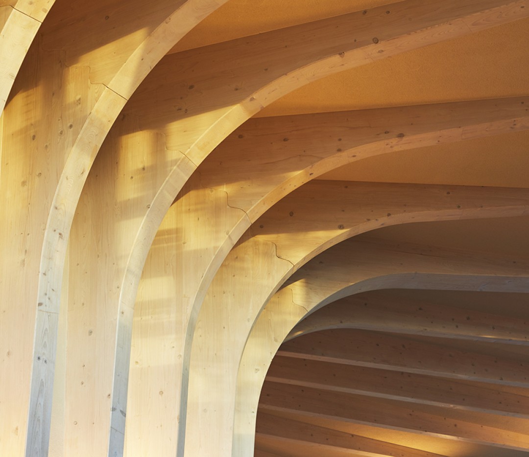 Sürdürülebilir biçimde üretilen ladin ağacından üretilen prefabrik öğelerle inşa edilen projede yer verilen gözenekli malzemeler yapının nefes almasına olanak sağlıyor. Yapının doğal yollarla havalanmasına ve içerideki nem oranının kontrol edilmesine olanak sağlayan bu tasarım kararı dikkatli bir biçimde binanın form ve oryantasyonu göz önünde bulundurularak alınmış.
