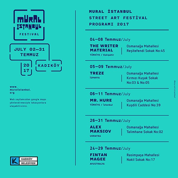 4-31 Temmuz tarihleri arasında gerçekleşecek olan, 3 yerli 3 yabancı sanatçının 6 duvar ve 1 zemin çalışması ile katılacağı Kadıköy Belediyesi 2017 Mural Festivali, 4 Temmuz Salı Günü Eskişehir’den gelecek olan Writer Material adlı grup ile başlayacak.